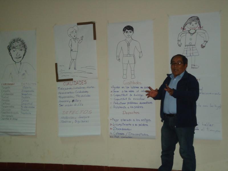 Docentes reunidos por equipos de trabajo, elaboran cuadros de mujeres y hombres para identificar y posteriormente socializar a sus colegas las cualidades y defectos de hombres y mujeres.