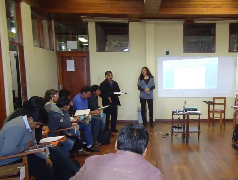 Ana Sanjinés, Técnico en formación técnica, del consorcio PROCOSI-CEMSE, explica a las y los docentes de institutos de Tarija y Potosí el objetivo del taller y los contenidos a ser abordados.