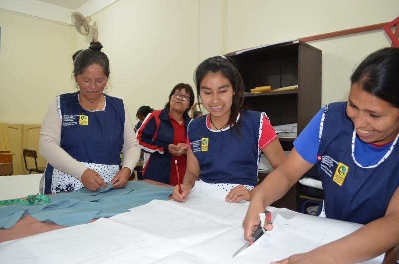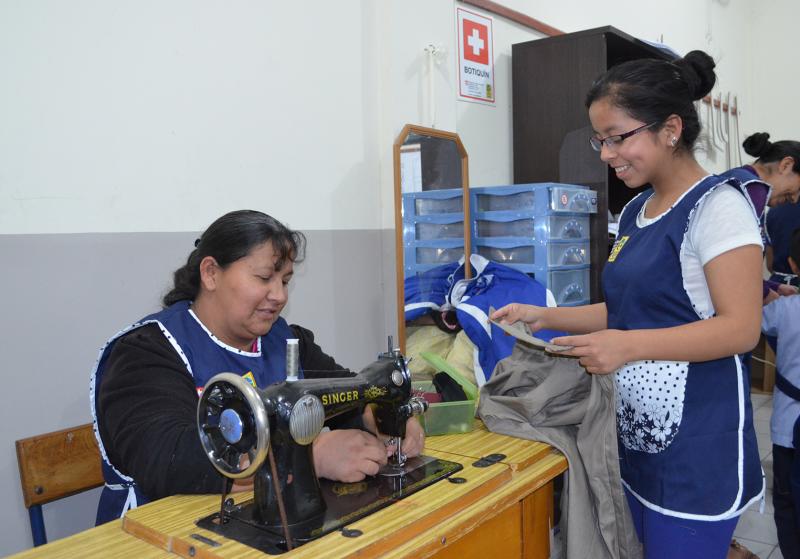 Algunas madres también van con sus hijos pequeños quienes juegan en el patio mientras su madres pasan clases y ellas, también, los usan como maniquíes para cuando se tiene la instrucción de elaborar trajes para pequeños. Sobre este aspecto la docente Laura López indica que las participantes actualmente realizan uniformes para el kínder del colegio en el cual ocupan algunos ambientes. Los centros están abiertos a dar estas facilidades para que las madres puedan participar en una carrera técnica.
