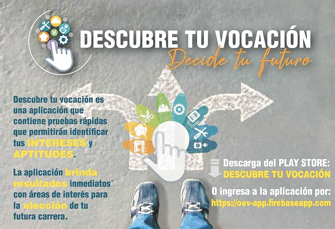 Nota: La plataforma virtual de Descubre tu vocación la encuentra en el sigueinte link   https://oev-app.firebaseapp.com/ y tambén se dispone de la misma para sistema Android que puede ser descargada desde el Play Store.  Esta es una iniciativa del proyecto Formación técnica profesional de la Cooperación Suiza en Bolivia que es ejecutado por Swisscontact-FAUTAPO.