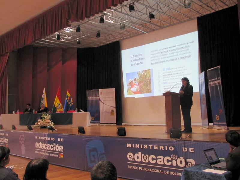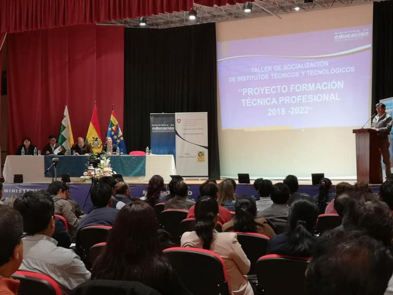 El Ministerio de Educación y el Proyecto Formación técnica profesional de la Cooperación Suiza en Bolivia dieron inicio a las actividades territoriales de este proyecto con 40 Institutos Técnicos Tecnológicos en un evento realizado el martes 19 que dio a conocer las características y alcances del proyecto, las políticas y procedimientos que rigen su ejecución, gestión y seguimiento.
