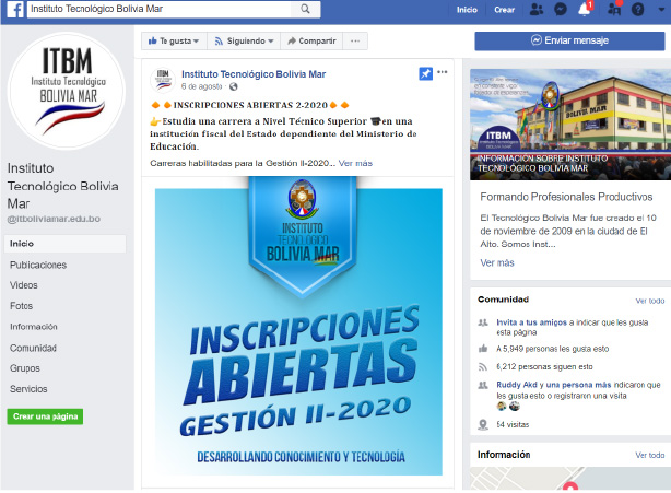 El Instituto, según nos cuenta Ticonipa, creó en el 2016 su Fan Page (Instituto Tecnológico Bolivia Mar) que contaba con pocos seguidores y, con el trascurso del tiempo, se toparon con nuevos retos para mejorar este espacio como el contar con un profesional en diseño, definir qué información era relevante mostrar y así fueron impulsando el sitio.