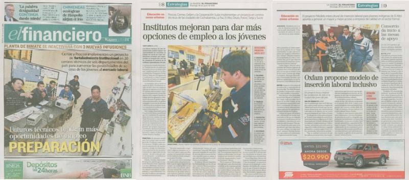 Claudia Arandia, responsable de proyecto, precisó que el consorcio Procosi-Cemse capacitará a su vez a directores, docentes y administrativos en temas de inserción laboral como género, empleabilidad y emprendimiento con otros B. 15 millones, provenientes también de recursos suizos.