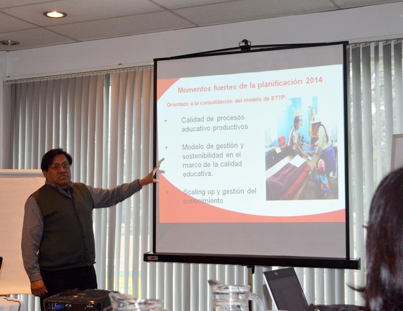 David Coaquira exponiendo los hitos claves para esta gestión a implementarse por la Comisión Episcopal de Educación, un socio del proyecto con amplia experiencia en formación técnica.