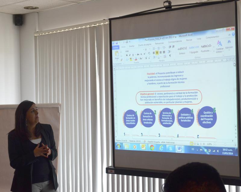 La coordinadora del proyecto Formación técnica profesional, Eliana Arauco, brindó algunos criterios de trabajo a tomar en cuenta con las instituciones socias, además de resaltar los hitos claves para el cumplimiento de las metas propuestas.