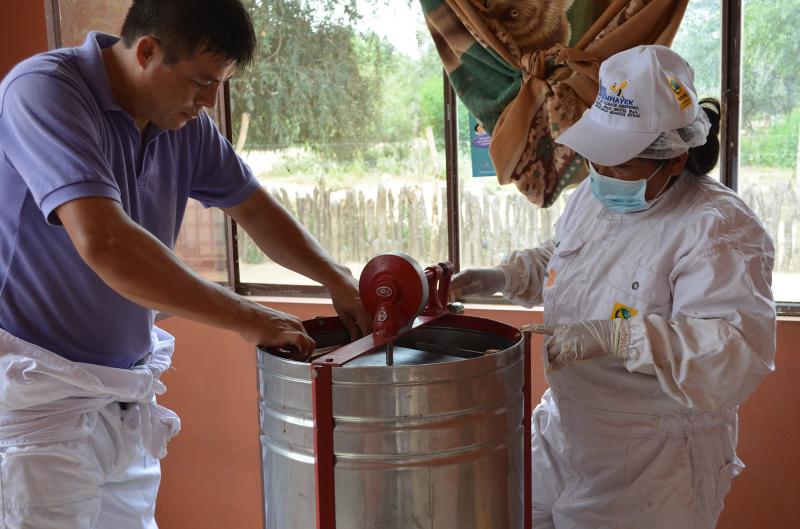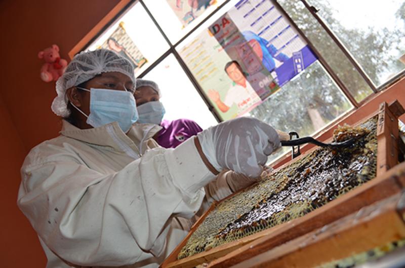 Las y los participantes, con mandil, mascarilla y gorro blanco, logran un producto de calidad para el consumo. Así en un espacio determinado para el empaque los(as) participantes cuentan con el equipamiento respectivo donde, luego de cosechar la miel del apiario, proceden con el raspaje de las celdas para aflojar la miel y, luego, pasan al centrifugado respectivo que permite extraer una miel deliciosa. Luego, utilizando un tamiz, para una de las coladas, garantizan quitar las impurezas de la miel.