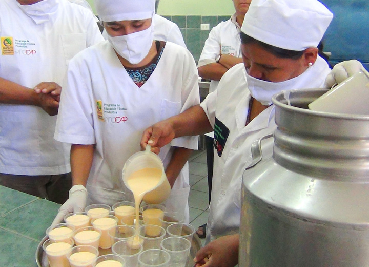 Otra participante, Roxana, expone – de forma práctica- como elaborar un yogurt con sabor a durazno a tiempo de indicarnos que ellas pasan cinco días de clases prácticas y sólo una de teoría. “En las universidades se lleva mucha teoría, aquí la mayor parte de lo que aprendemos es práctica, situación que nos permite tener mayor experiencia y agilidad”, afirma.