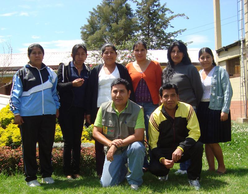 Los y las asistentes al taller de “Mantenimiento y Reparación de máquinas de confección textil”.  De izquierda a derecha los(as) docentes: Nancy Ocaña Barrientos (Totora), Patricia Quintana (Totora), Flora Grágeda (Aiquile), Lucy Salvatierra Crespo (Mizque), Ruth Ana Soria Alvarado (Mizque), Nely Gálvez (Mizque), de cuclillas José Arenas Zelaya (facilitador) y Juan Iquise Apaza (Mizque).