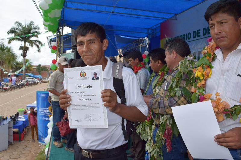 La certificación de competencias y el curso de 800 horas de capacitación, fue posible gracias a una alianza estratégica entre el Ministerio de Educación y el Ministerio de Desarrollo Rural y Tierras, y sus instancias dependientes como, el Sistema Plurinacional de Certificación de Competencias (SPCC) Dirección General de Educación de Adultos (DGEA) a través de Educación Permanente; y el Fondo de Desarrollo Nacional, respectivamente (FONADAL).