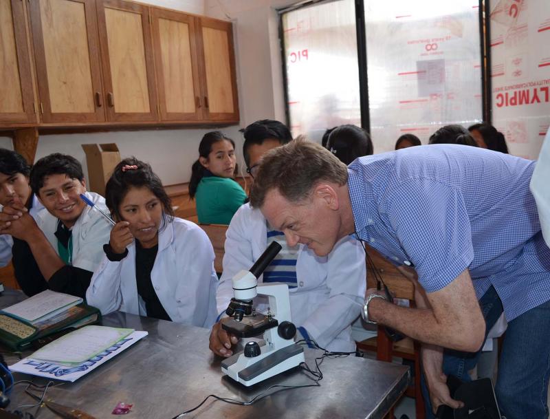 El embajador de Suiza, Roger Denzer, se interiorizó con algunos estudiantes sobre el uso de los microscopios para la carrera de agropecuaria, participantes que antiguamente sólo contaban con pocos de estos intrumentos. A la fecha, gracias al apoyo que tiene el Instituto, pueden hacer uso de microscopios con mayor frecuencia y precisar los conocimientos que se les imparte con las herramientas adecuadas.