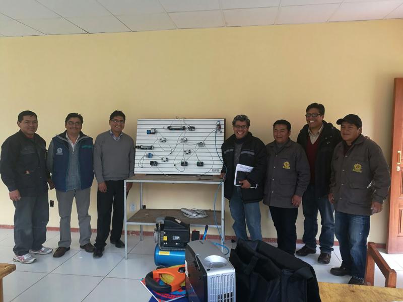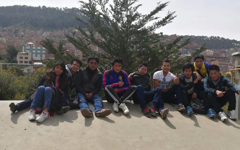 Un grupo de estudiantes de la carrera de química industrial, es una de las carreras que cuentan con un mayor porcentaje de mujeres aproximadamente el 70% con relación a 30% de hombres. En este grupo se puede observar que además del docente solo hay un estudiante varón. La coordinadora del proyecto Formación técnica profesional de la Cooperacion Suiza en Bolivia, Eliana Arauco, tuvo la oportunidad de conversar con el docente y estudiantes.