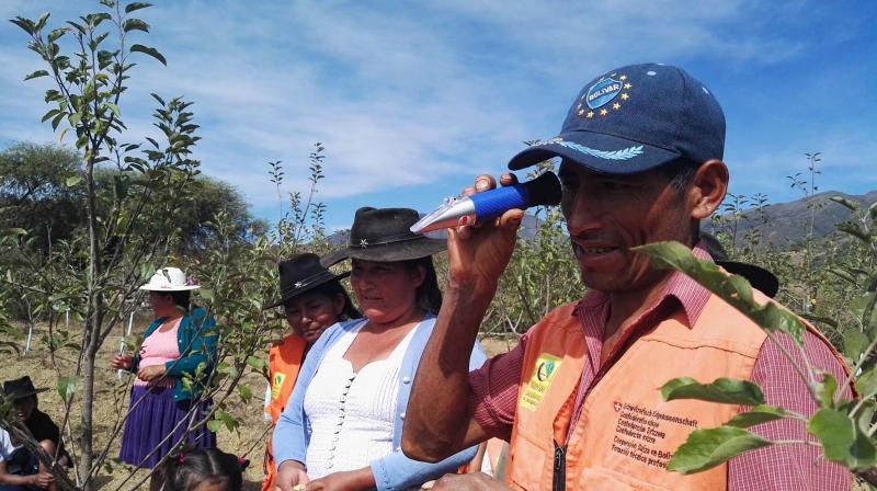 Pedro Rodas quien hace uso de un refractrómetro verifica, delante de los visitantes, que la manzana esté madura para poder cosecharla. Nos indica que si llega a 14 grados quiere decir que está lista para su cosecha. Como lo menciona Pedro, este año cada planta produjó 40 kilos, lo que significa 2 arrobas por árbol y un logro de 142 arrobas de todos los árboles con los que cuenta. De ese total, vendió el 40% y eso le significó un ingreso neto de Bs. 5.300. Ha recibido el apoyo de la Alcaldía para poder llevar las manzanas al mercado local y venderlas, agrega. El resto se quedó para el consumo de su familia y también hizo trueque para obtener otros productos.
