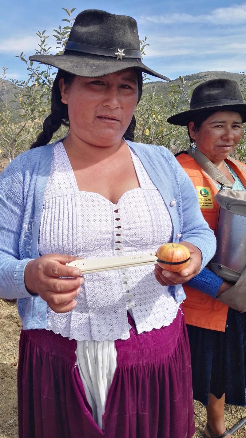 Una productora de manzana, sostiene un calibrador manual, el mismo que fue comprado en del concurso lanzado por Fondo Equidad y por ser una Buena Práctica seleccionada desde el mismo Fondo. El calibrador les sirve para medir el tamaño de la manzana y saber el peso, de acuerdo a esos datos se hace la selección de las manzadas que se venderán en el mercado.