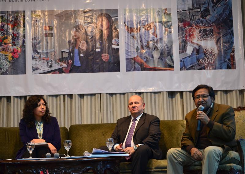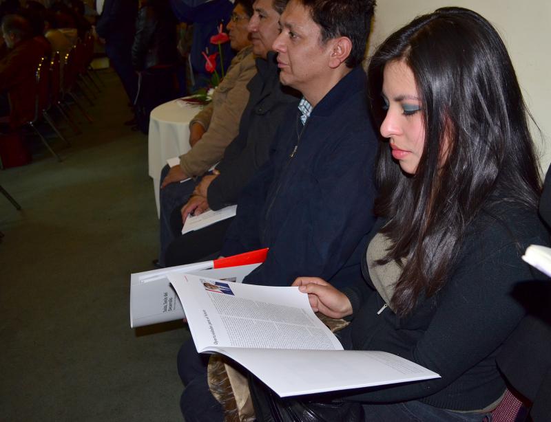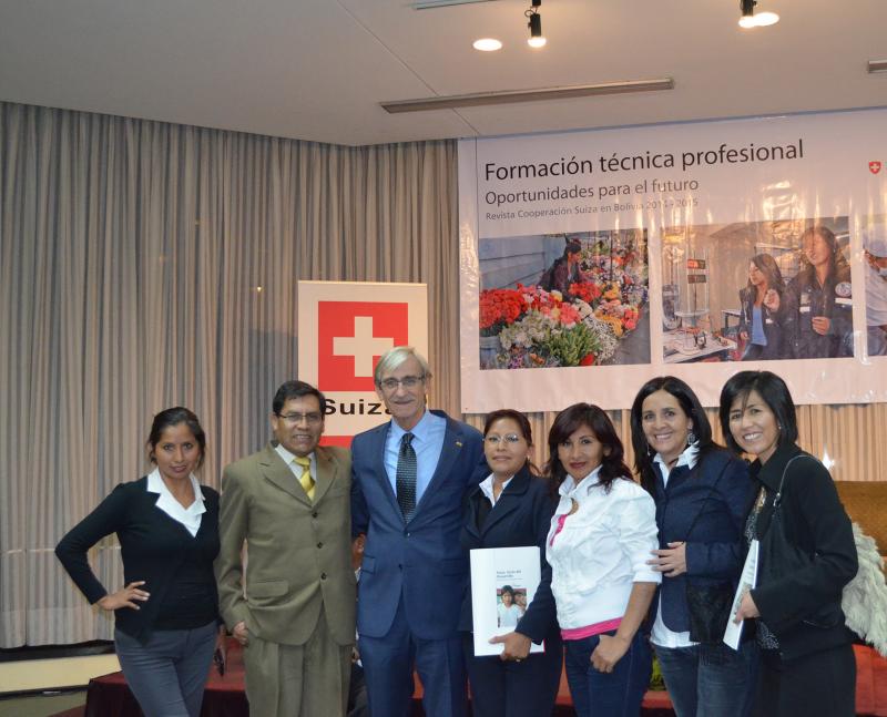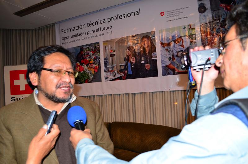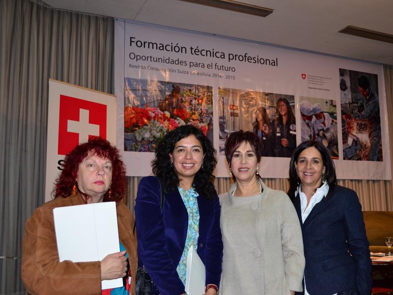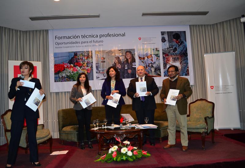 La revista 2014 - 2015 de la Cooperación Suiza en Bolivia, titulada Formación técnica profesional: Oportunidades para el futuro, se presentó anoche en instalaciones del  Real Plaza Hotel de la ciudad de La Paz.  El acto contó con la presencia del Embajador de Suiza, Sr. Peter Bischof y continuó con un interesante Coloquio en el que participaron Noel Aguirre Ledezma, Viceministro de Educación Alternativa y Especial; Gabriel Dabdoub Álvarez, Presidente de la Fundación INFOCAL (Instituto Nacional de Formación y Capacitación Laboral); Aida Ferreyra Villarroel, antropóloga, especialista en educación y género; y Amparo Ergueta Tejerina, Oficial Nacional de Programa de la Cooperación Suiza en Bolivia.