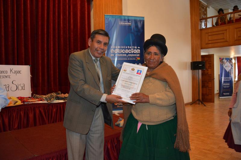 Esta certificación a trabajadores y productores del Altiplano se cumplió en coordinación entre el SPCC, dependiente del Viceministerio de Educación Alternativa y Especial del Ministerio de Educación y la Confederación Departamental de Mujeres Campesinas Indígenas Originaria de Bolivia “Bartolina Sisa”.