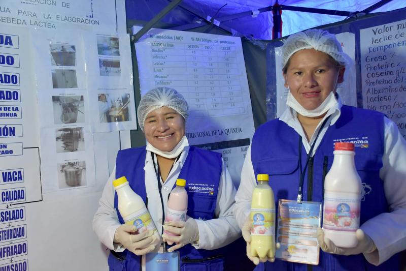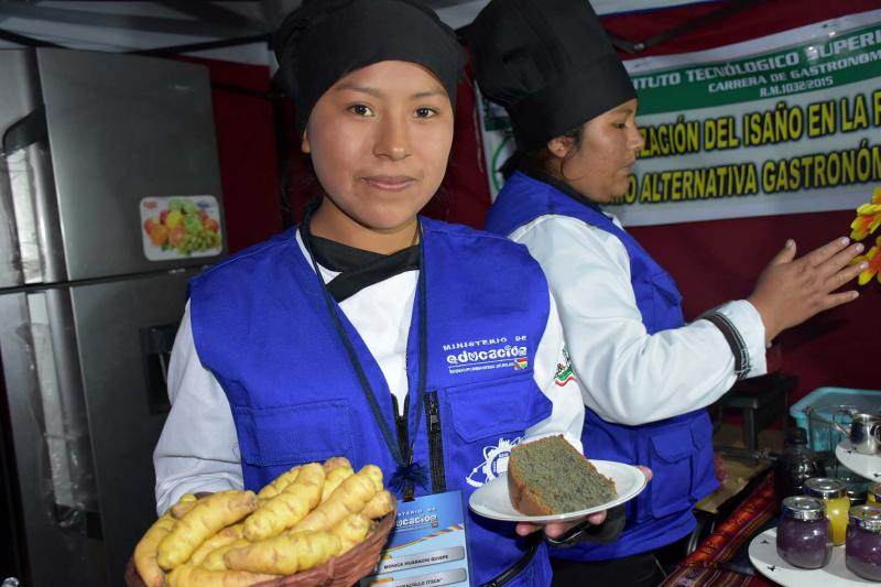 Jheovana Ramirez y Mónica Huarachi presentaron pasteles y platos para degustar utilizando el izaño en la repostería y cocina.  Ellas representaron al Instituto Tecnológico de Caracollo de Oruro.