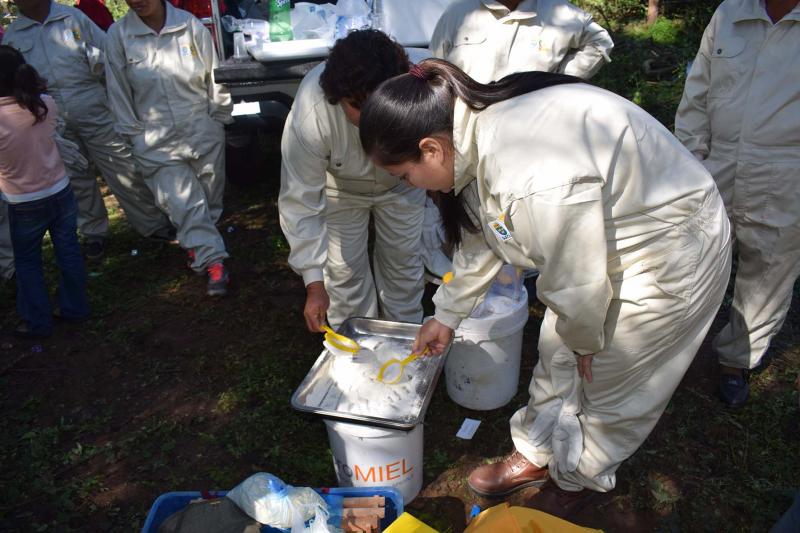 Luego de la concentración y posterior traslado al apiario piloto de la Fundación FAUTAPO, regional Chaco, se desarrolló de forma práctica y demostrativa, las técnicas de preparación de alimentos energéticos y protéicos para las colmenas que se elaboran en base a una serie de insumos como: azúcar impalpable, complevita, sulfa, manzanilla, ajo, sustituto lácteo, romero, tomillo, vaselina, etc.